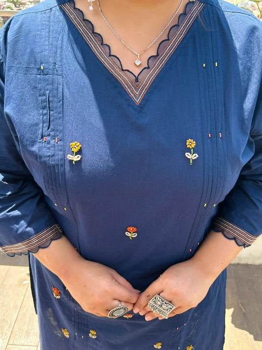 Dark Blue Embroidered Plus Size Cotton Suit Set