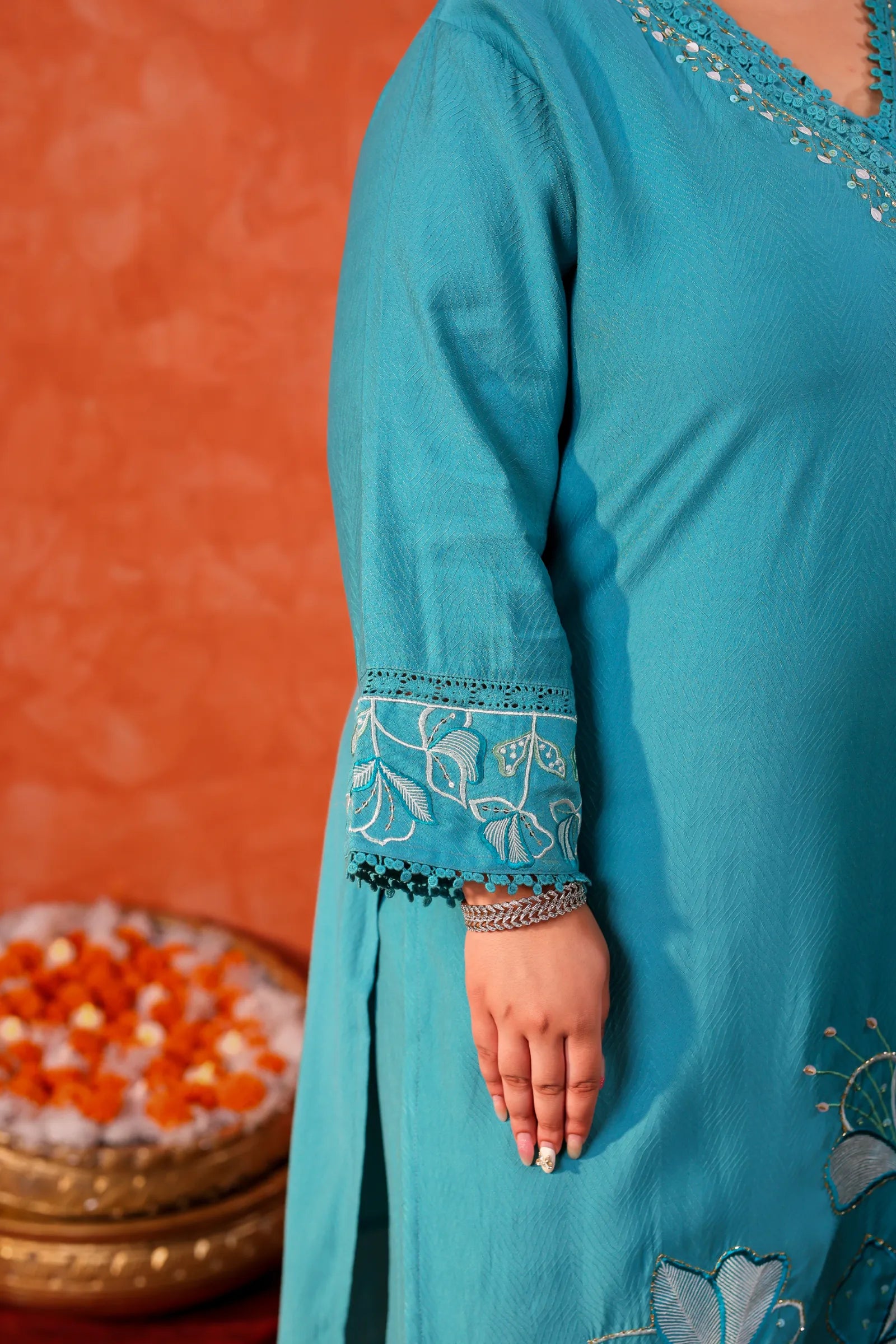 • Applique solid kurta with embroidered neck detailing