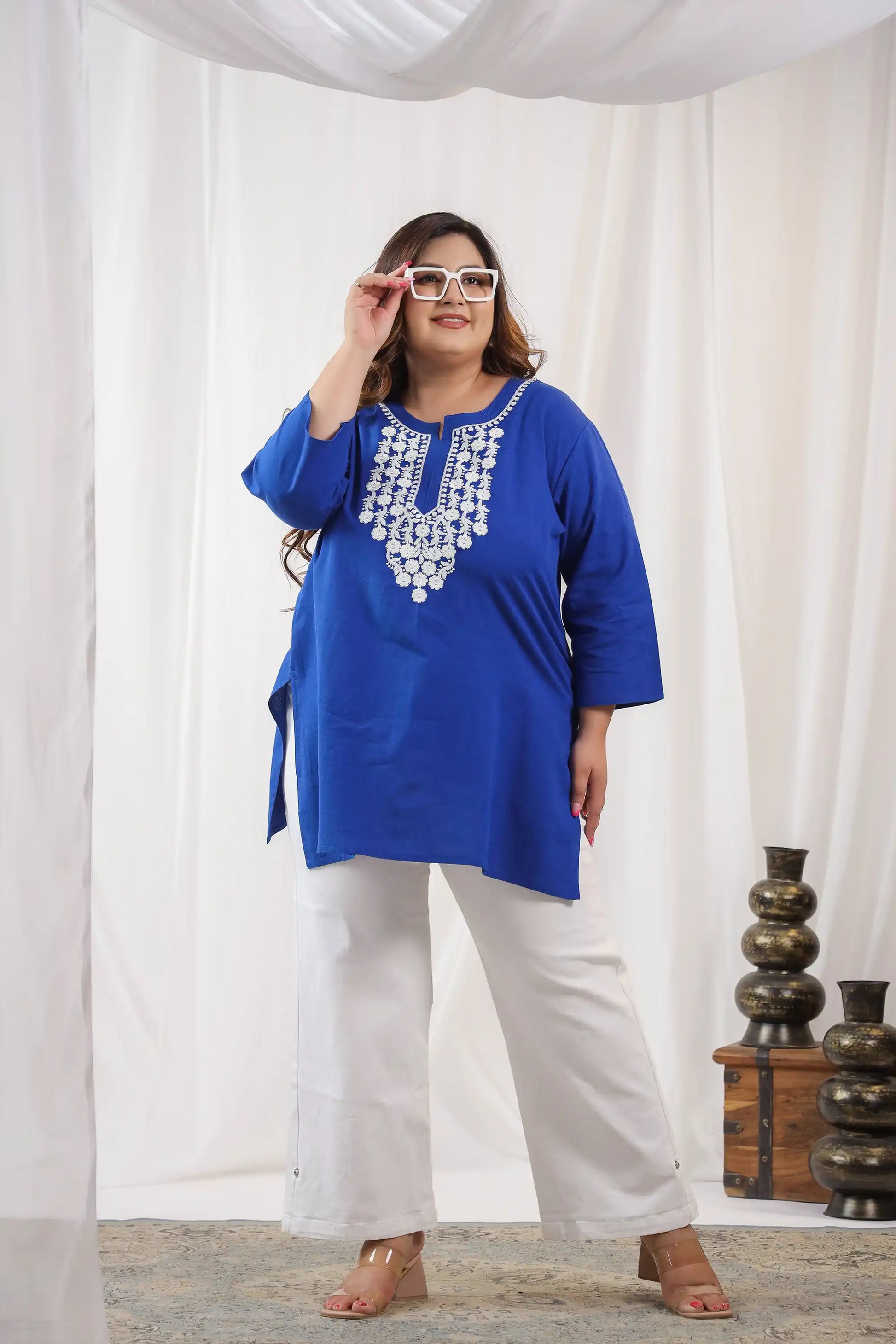 Blue Embroidery Plus Size Short Kurti