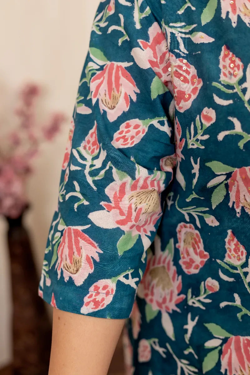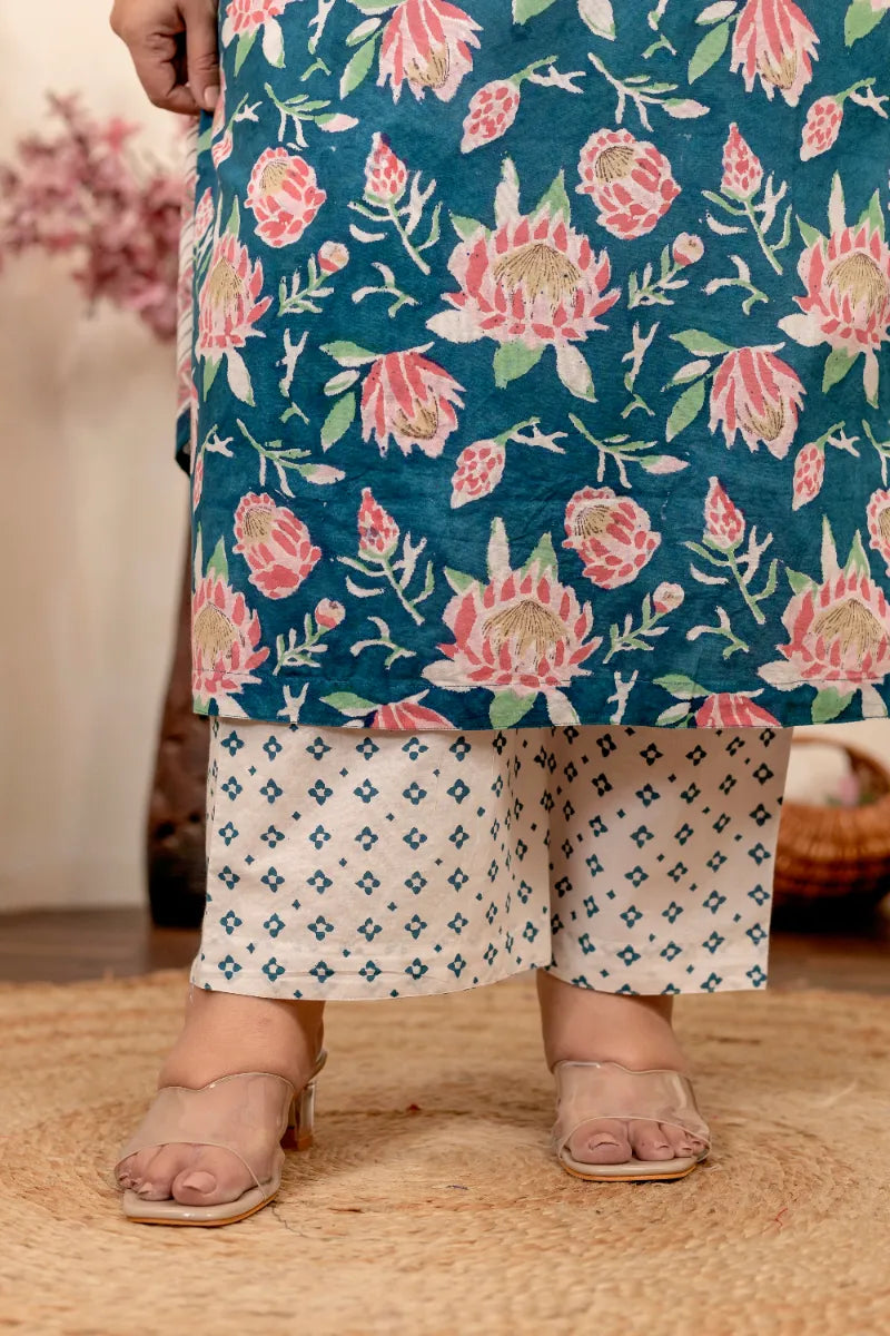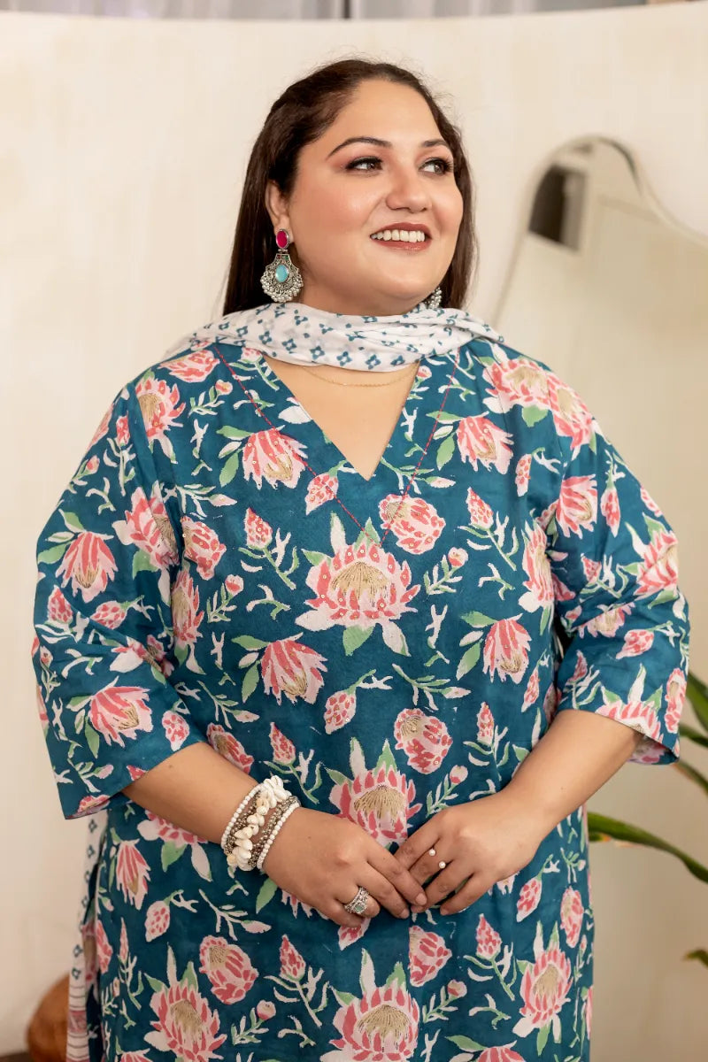 Blue Pink Floral Plus Size Handblock Suit Set