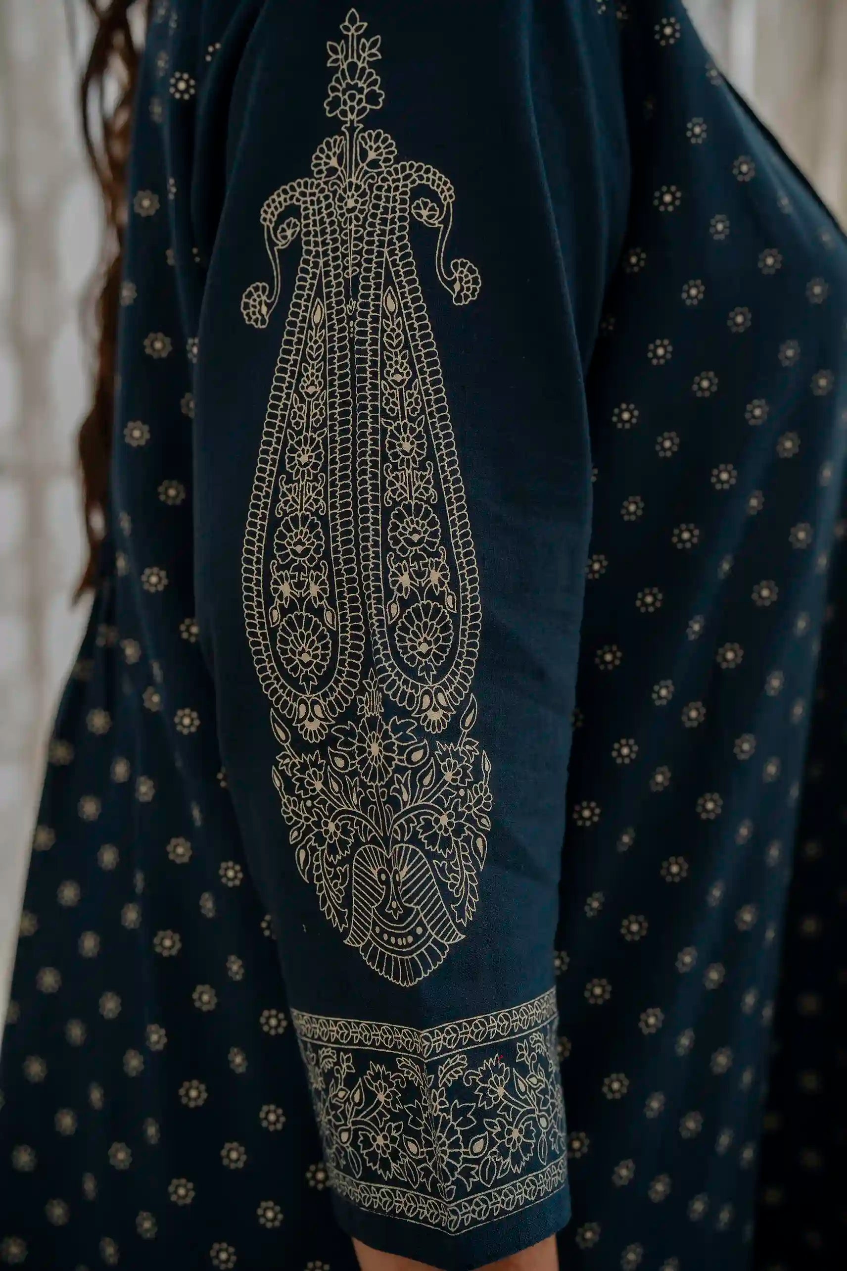 Blue Printed Pintucked Gathered Plus Size Kurti