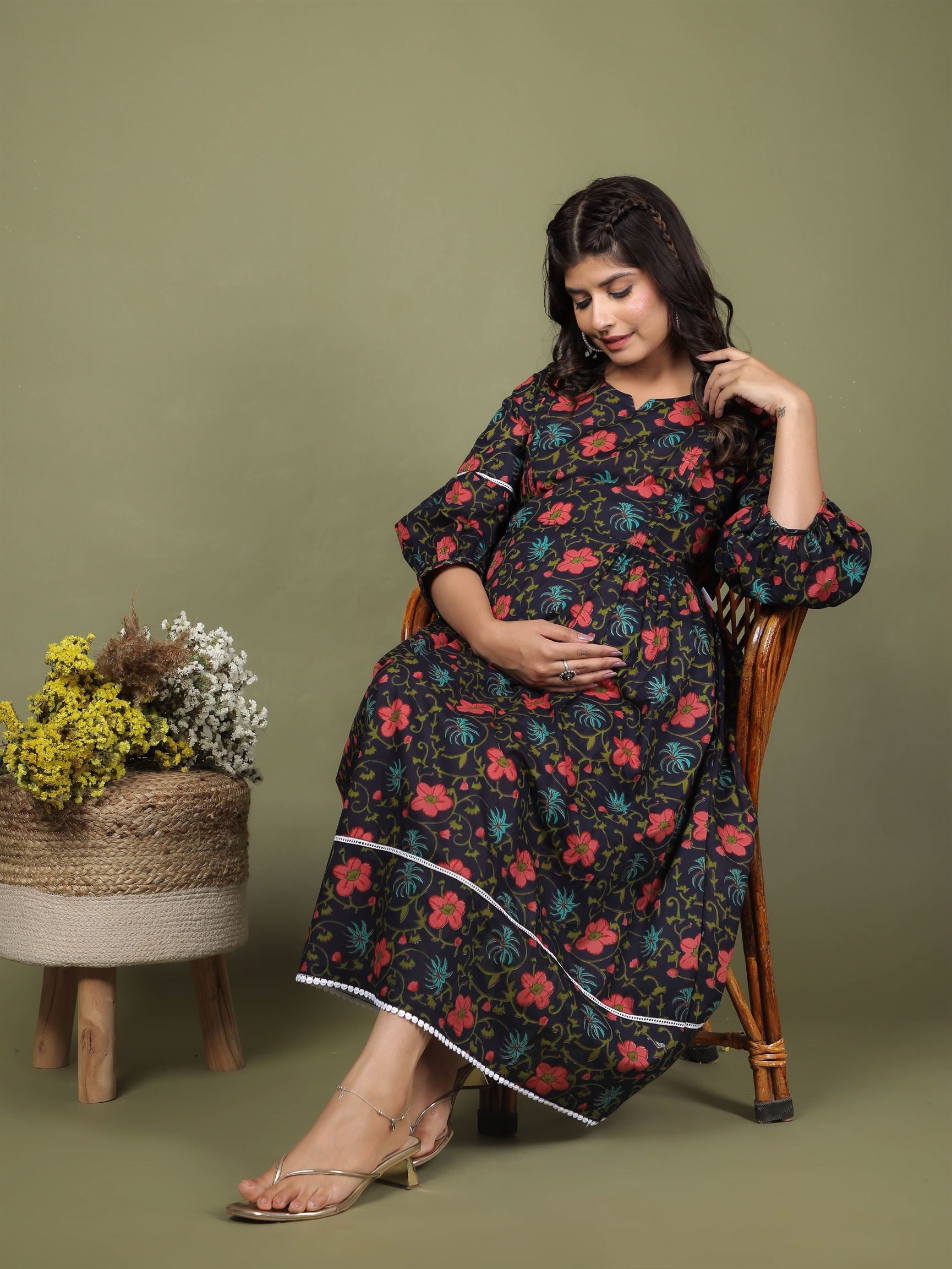 Look stunning while remaining comfy and cozy in this beautiful Floral Dark Blue Maternity Dress. Perfect for your special occasions, this dress will make you look like a queen while your baby bump is the cherry on top! Show off your impressive style without any of the fuss.