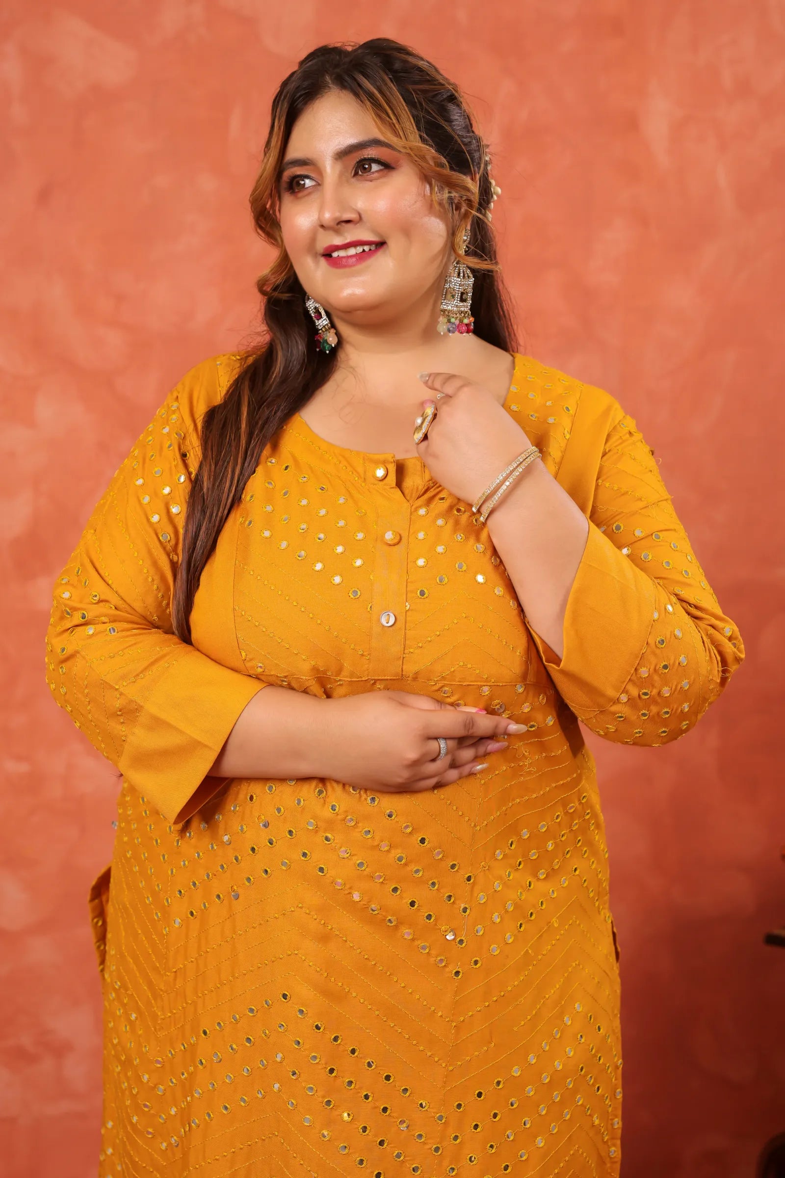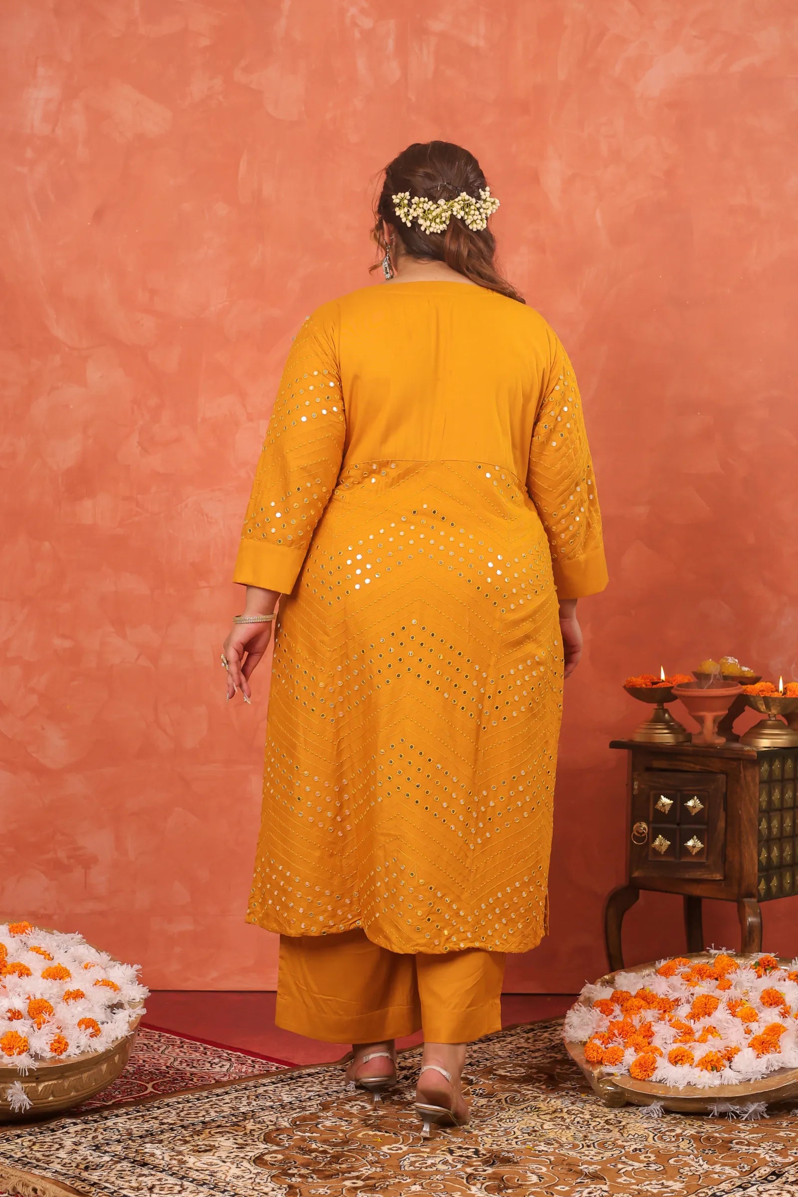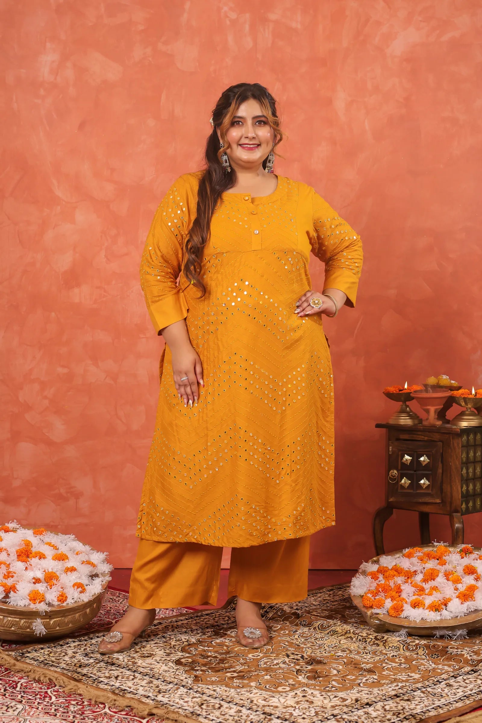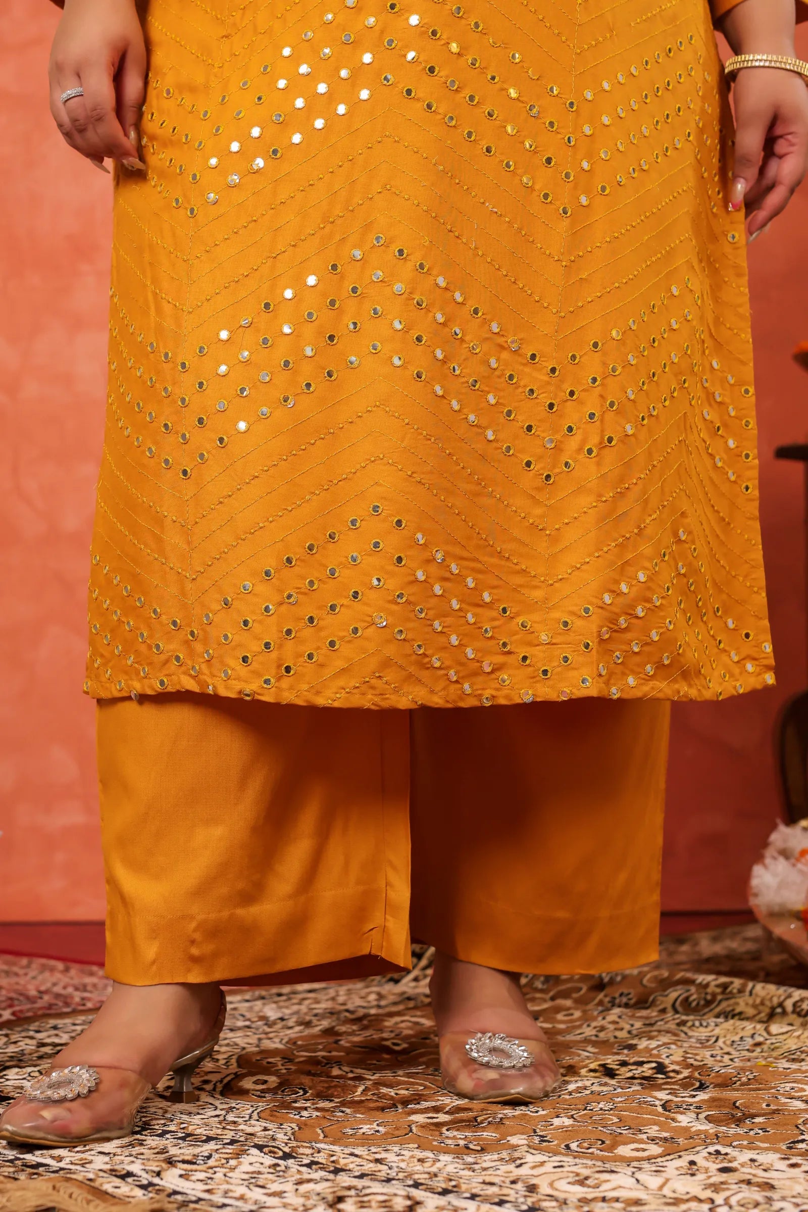 Mehboob Mustard Mirror-work Plus Kurta Pant Set